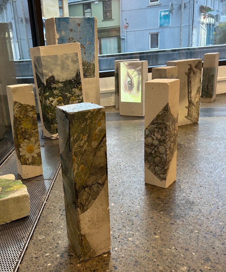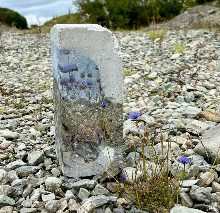 Concrete blocks hold fragmented images from this magical island, images of insects and birds, and of delicate flowers, herbs, grasses, shrubs, and tiny little trees, that have erupted from between the stones and rock. The summer beacons are now gone but are immortalised on these blocks, blocks that are made from fragments of the local geological past, this installation re-unites event and actor, as past and present become known.